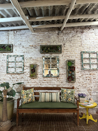 Embora a comida desse restaurante seja uma delícia, com sabor e variedade para todo lado, e o atendimento seja eficiente e muito simpático, o verdadeiro ponto marcante é o ambiente. Para começar, claro, a entrada, uma porta minúscula que nos leva a um corredor que só então nos faz chegar ao restaurante de fato, quando entramos mais parece que estamos adentrando um club secreto, daqueles de filmes, a decoração parece uma mistura de casa da vovó, restaurante ao ar livre (sem ser ao ar livre), com decoração hippie, tudo misturado criando algo único e original pois, não daria para lembrar dele apenas citando um desses estilos que disse parecer o compor, só da para descrevelo justamente misturando tudo! É bem climatizado e com mesas e cadeiras confortáveis. É engraçado que sua localização poderia levar seu ambiente ser seu ponto fraco e conseguiram reverter a situação, enquanto muitos restaurantes por ai ficam em belas esquinas de praças e de frente a pontos turísticos, e não conseguem explorar isso ao seu favor, aqui nesse lugar escondido em algum espaço desocupado na parte de trás de portas comerciais comuns, foi transformado em um restaurante com exploração perfeita do ambiente. De crítica fica só a questão de não ter self-service livre, para quem come um pouco mais a opção do peso pode as vezes trazer uma surpresa financeira...