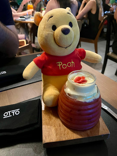 Read moreSobre a comida: pedimos dois pratos individuais (todas as opções do cardápio são individuais): um bife de chorizo com arroz e farofa (105 reais)... achei bem simples e a carne embora boa, tinha pouco sal. Esse prato acho que não valeu o preço. O outro prato foi Filé ao Jack (também 105 reais) e estava melhor. A carne bem mais saborosa com um queijo por cima e um macarrão com molho branco de acompanhamento. As porções são bem servidas. Pra beber compartilhamos esse drink que vem um ursinho fazendo parte da apresentação. A bebida veio em um pote de mel com uma camada de espuma doce em cima que fica uma delícia quando a bebida do fundo passa por ela. Custou 35 reais. Sobre os preços: como já disse, cada prato individual custou 105 reais. Essa é a média, tendo pratos de 90 até uns 130 mais ou menos. Os drinks também ficam na casa de 30 ou 40 reais. Heineken long neck 16 reais. Couvert artístico de 10 reais por pessoa (11, pq cobram 10% também sobre isso) para um DJ colocar uma playlist pra tocar hehe. Sobre o ambiente: é bonito e bem decorado, mas é relativamente pequeno. Como vi em vários outros comentários, também tinha DJ na noite em que fui. E como falei acima, cobram couvert por isso. Consideração final: para mim, não vale o preço que se cobra. Um prato foi razoável e outro bom, mas há opções melhores com preço muito mais em conta na cidade. Pagar por um DJ colocar uma playlist também não me parece legal. Foi bom ter conhecido, mas não devemos retornar ao...