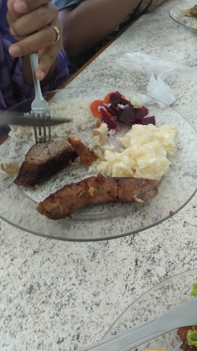 Local não é muito legal, único aberto na cidade no domingo. Parece q os restaurantes da cidade fecham para o almoço, só pode. Banheiro estava sujo, atendimento bem ruim por parte do balcão onde pesam os pratos. Garçonetes pareciam assustadas pela moça que gerencia, não sei se é dona. Cheguei as 13 da tarde, e tinha pouca salada e não tinha mais carne. Restaurante estava com quase todas as mesas cheias. É só fechada as 14. Poderia ter mais variedade de salada, a polenta frita, estava sem tempero e crua. Batata frita 50% batata, 50%óleo. " Cereja do bolo", quando pedimos um pedaço de um bolo q estava no balcão, a moça que aparentemente gerencia o local, recusou nos vender, pois só nos daria uma fatia do bolo, após terminar um outro que estava já fatiado e com uma cara de estar fazendo aniversário no balcão. Resumindo, se quiser bolo de hoje venha amanhã, ou...