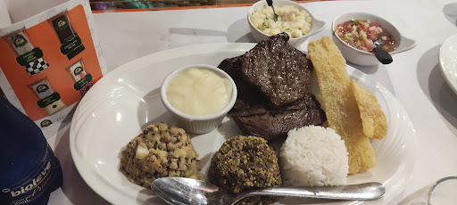O ambiente é bem característico do nordeste, que vai desde os móveis até a decoração do espaço, o que considerei bem interessante! Ele é refrigerado e possui funcionários atenciosos! Em relação à comida, pedi um prato executivo que custou R$46,90 e veio com 7 guarnições: macaxeira frita, feijão tropeiro, farofa de ovo, arroz branco, paçoca de carne, pirão e vinagrete com uma fatia de picanha e uma de carne de sol. A única coisa que senti falta foram opções no cardápio para 2 pessoas, logo me senti na necessidade de pedir um prato executivo, visto que as demais opções eram bem custosas e indicados para 3/4 pessoas, diante disso deduzi que não daria conta de comer as demais opções do cardápio por estar na companhia de uma pessoa. Então, pra quem vai em casal, tem poucas opções...