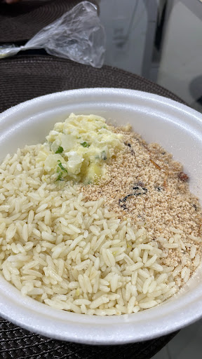 Saboroso Batata frita, gostei, arroz , farofa, molho da batata, vinagrete.. etc..