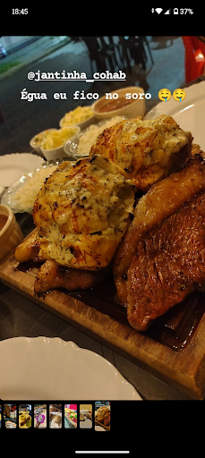Enquanto ao prato: Pedi a Opção Jantinha Steak que vem 2 cortes de ancho, Baião, vinagrete, farofa, salada (sempre uma porção pra cada pessoa) 1 pão de alho e uma porção de batata grande. Achei as porções bem satisfatórias, a carne pedimos bem passada e veio da forma que solicitamos, estava uma delícia. A batata realmente é uma porção grande e a maionese caseira estava boa. A porção da comida satisfaz tranquilamente.