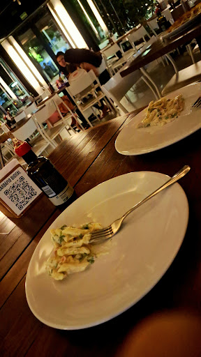 Vimos muitos comentários na Internet sobre esse restaurante e resolvemos experimentar.... Porém todas as expectativas foram superestimadas e nos decepcionamos com o lugar. Desde a entrada, fomos recebidos pelas garçonetes que nos indicaram uma mesa. Já nesse momento vimos o quanto é pequeno o lugar, não por acaso que existe um espelho na parede para dar a "sensação" de grande, porém fica só na sensação mesmo. Após sentarmos ficamos aguardando alguém vir nos dizer o que eles serviam, já que não é só de pizza que o restaurante oferece, mas não nos perguntaram nada além do: Nosso cardápio está no QR code, qualquer coisa só chamar! E foi embora, então eu quem tive que chamar e dizer que não conhecíamos o ambiente e que não sabíamos o que pedir. Pronto ai nesse quesito fomos bem orientados! Que o rodízio de MASSAS é R$ 50,00 de terça-feira à sexta-feira (mas é massas viu gente, não entra pizza na conversa) e são pouquíssimas opções (5 na verdade). Dentro desse pacote vêm as opções de frango empanado, filé empanado e um croquete de carne adivinha? Empanado? sim. Todos fritos por imersão em óleo. De sobremesa pedimos uma pizza de chocolate, todas as doces são de 15 cm ou seja 4 pedaços pequenos. Ela não veio muito quente e o recheio usam chocolate Confeti ao invés do M&M's como na foto e o chocolate usado tem um residual forte de manteiga de cacau, o que deixa a pizza brilhosa mas com um gosto desagradável para quem aprecia chocolate. Quanto as bebidas, para quem não bebe as opções são poucas: refrigerante, suco (2 tipos) e água, é isso. Conforme foi ficando mais tarde, mais famílias e amigos foram chegando e o espaço foi ficando mais apertado do que antes.... e as garçonetes já não olhavam para os clientes e deixaram muito a desejar no quesito de atenção ao olhar todas as mesas. As mesas são pequenas e as cadeiras são extremamente desconfortáveis, tirando a parte do banco estofado americano de algumas mesas, que são um pouco melhores para sentar. Achamos que o ambiente precise de uma atenção, porque tem paredes estufando com umidade, fios de tomadas soltos e a aparência de pintura desgastada. Ao pedir a conta, ainda tivemos o acréscimo de 10%, estou para descobrir em quê está sendo investido...