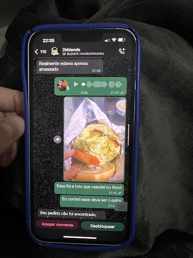 Read morePedi um lanche pelo iFood e solicitei que fosse pagamento na entrega no crédito, o motoboy veio sem a maquininha, até aí tudo bem, quando abri um dos lanches um hambúrguer veio sem a carne, abri tirei foto e mandei pelo iFood, mas não poderiam me estornar porque o pagamento foi feito na entrega, em tentativa de contato é quase impossível, não atendem telefone e no WhatsApp é só robô, enfim quase pedindo socorro não atenderam, falaram q iam mandar outro e pediram o errado, o motoboy veio com dois hambúrguer certo, devolvemos o errado e pegamos somente um, pois era só um que veio errado, chegando lá o atendente mandou uma mensagem bem desaforenta dizendo q nossa hambúrguer tinha carne sim era só ter aberto o pedido, mas o hambúrguer que estava sendo olhado era o outro q tinham enviado para nós. Resumindo, o hambúrguer é gostoso, mas pelo atendimento e descaso desde o momento do início da entrega, não pediremos mais. Assim como pode se ver nas fotos e posições dos ingredientes não tinha carne nenhuma, e acho q a loja deveria prezar mais pelos cliente e respostas para não terem q passar por coisas...