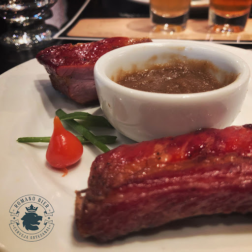 Ceviche de salmão ao leche de tigre, harmonizado com o chope Cristal. - Salsicha alemã acompanhada de torradinha de mostarda e mel, harmonizadas com a cerveja de trigo. Costelinha defumada com barbecue de cerveja e pera, harmonizada com a cerveja IPA. Cowboy angus Black com torradinha de creme de alho, harmonizado com a Trippel.