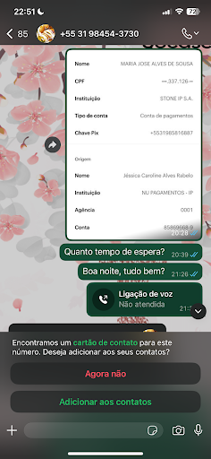 A partir desse ponto, não obtive mais qualquer resposta. Mandei várias mensagens, totalmente ignoradas. O lanche nunca chegou. Eu e meu marido aguardamos até quase 1h da manhã, com fome, extremamente frustrados, e o mínimo que esperávamos era respeito e transparência. Tenho print de todas as mensagens.