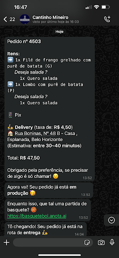 Fiz meu pedido às 13:50 e realizei o pagamento via Pix, pensando em agilizar a entrega, já que estava chovendo. Às 14:04, recebi uma mensagem no WhatsApp dizendo: ‘Tô chegando! Seu pedido já está na rota de entrega.’