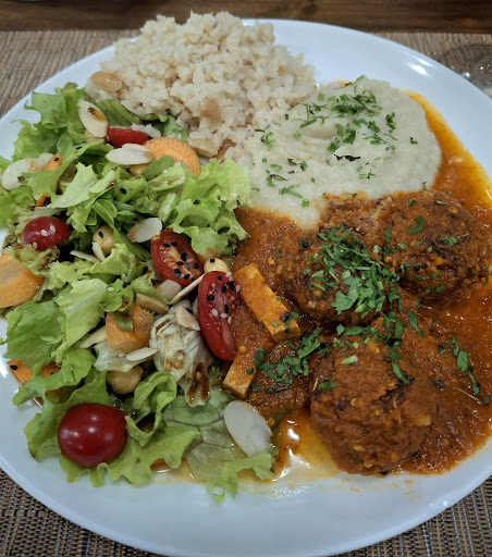 Pedi o prato Kofta, com almôndegas de legumes, arroz integral, purê de batata e salada. A comida estava bem temperada, era gostosa, mas achei pouca quantidade servida e quase não tinha tofu no molho. Pedi vinho tinto do cardápio, mas não tinha, então optei pelo rosé.