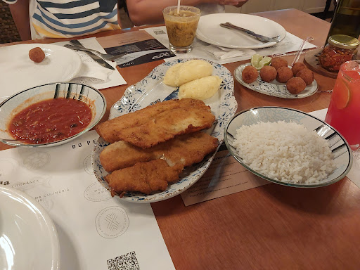 Experimentamos o bolinho de bacalhau e o filé de peixe napolitano.