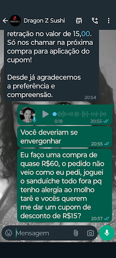 3º) Por último, esse é o primeiro restaurante japonês que já vi na minha VIDA que o sachê de molho shoyu (que deve custar centavos para eles) é cobrado. Eu fiz um pedido de 80 reais e me falam a PACHORRA que eles entregam UM SACHE de cortesia. Eles cobram na coisa mais barata que o restaurante oferece e que é essencial para a experiência do usuário (afinal, pouquíssimas pessoas comem sushi sem shoyu). É mais fácil cobrar por wasabi, gengibre do que pelo sachê que é barato e ESSENCIAL para deixar a comida saborosa. Comi 40 peças descendo secas na garganta e me fez notar que eu me esforcei demais para achar graça no serviço de vocês, mas vocês não devolvem o esforço dando um mínimo de atendimento bem feito ao cliente.