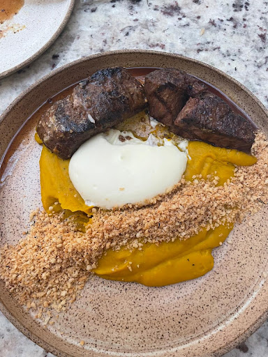 Ao voltar para a mesa, nos informou que “é um erro de digitação, o prato não leva esse ingrediente, fiquem tranquilas.”