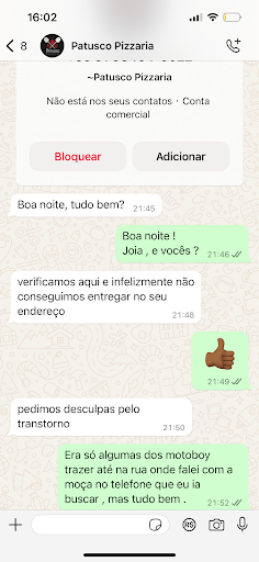 Read moreEstou passando aqui para deixar um Feedback horrível que tive no dia 26/10 na pizzaria . Sempre comprei pizza na patusco e nunca tive problema, e sempre quando fazemos pedidos compramos mais de 3 pizza . Sábado no dia 26/10 liguei na pizzaria e a antes de realizarem o pedido eu perguntei a moça se estava fazendo entrega no endereço devido a chuva ,e a moça me disse que sim , então realizei o pedido e fiquei aguardando o tempo que estimaram a entrega . Só que depois de 1 hora e 20 min me ligaram dizendo que não iam puder entregar no endereço porque nem um dos motoboy se disponibilizou, eu até conversei com a moça e falei que poderiam trazer em outro endereço que eu já tenho cadastrado que eu ia até lá para receber porque era de melhor acesso. Então a moça disse que poderiam aguardar que iam trazer , então aguardei mais 20 min e entraram em contato pelo WhatsApp dizendo que infelizmente não poderiam trazer , aí entrei em contato com um rapaz que trabalha de motoboy lá para vê se ele estava em rota e se poderia entregar , porque ele sempre trouxe e nunca tivemos problemas , só que infelizmente ele estava em outra rota e não pôde trazer , ele até pediu para mim esperar que ele iria tentar voltar mais rápido e entregar para a gente , só que como estávamos com fome e tinha muito tempo que estamos aguardando eu pedi na concorrente . O motoboy que sempre trouxe para a gente até pediu desculpa em nome de vocês , porque nunca tinha acontecido isso e que os donos não tem culpa pela incompetência de alguns funcionários. Só queria deixar relado minha decepção , o atendimento que tive no...