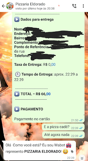 Read more04/05/2024 as 21:50 fiz um pedido pelo WhatsApp deles, pedido realizado com o prazo de entrega entre 22:29 e 22:39, quando deu o horário mandei msg, eles ñ havia visualizado e nem anotado o pedido para fazer, e se quer deu uma resposta. Essa é a segunda vez que peço com ele, não pedirei mais, deixei de comprar em outro lugar e eles fazem...