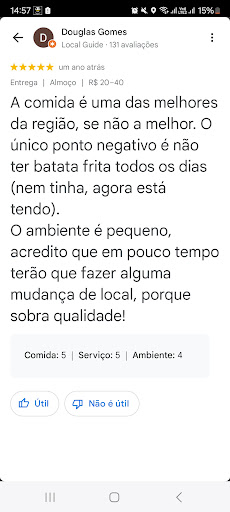 Read morePéssima experiência, não comam ou comprem nesse restaurante!!! Fiz o pedido pelo iFood, previsão de entrega era de 1h-1h10min. Passaram-se 1h30min, mandei mensagem e a loja não respondia, liguei diversas vezes, só consegui falar com eles duas vezes, que afirmaram que estava a caminho mas iria atrasar mais 30min. Esperei o tempo previsto de atraso e nada, tentei ligar novamente e, quando finalmente atendeu, uma mulher chamada Késia disse que ia entrar em contato com o motoboy (do próprio restaurante) e me dava um retorno. Passaram-se mais 20min e não obtive resposta, simplesmente ignoraram, não atendiam e não respondiam o chat, maior descaso com o pedido e o cliente. No fim das contas o pedido sequer chegou a mim, e olha que já tinha pago previamento pelo aplicativo. Não comprem...