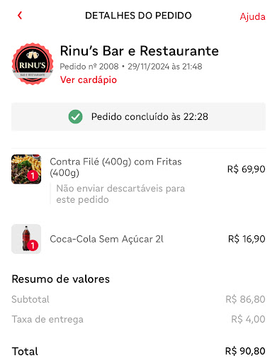 Sempre fui cliente do Rinu’s com meu namorado, frequentando o bar no período da noite após o trabalho. Hoje, decidimos comemorar o aniversário dele no local e reunimos mais de 30 pessoas — todos consumindo com comandas individuais. A conta da nossa mesa ultrapassou R$3.000, sendo que a nossa, especificamente, deu mais de R$ 400.
