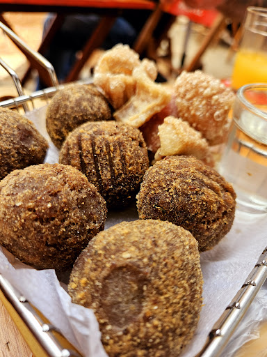 O Santa Boemia investiu na raiz dos botecos e eu achei a execução muito boa. Os famosos bolinhos são realmente muito gostosos! Macios, bem temperados e suculentos (principalmente quando você espreme neles uma das fatias de laranja que vêm no prato)