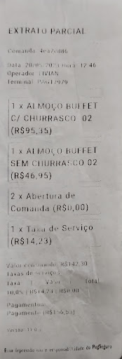 Fomos em uma quarta feira a noite no jantar, participar do rodízio. Local tranquilo, poucas pessoas (até estranhei baixo movimento), fácil de encontrar vaga pra estacionar. Fomos recepcionados por uma moça que perguntou se conhecíamos o local, falei que somente pelo Instagram. E ela explicou do rodízio que é a vontade, e o churrasco passa na mesa. Ok até aí! Alguns pontos: - Refrigerante e água com gás o garçom serve na mesa, mas é retirado de garrafas plásticas que ficam na geladeira, conforme vai abrindo e tirando vai perdendo o gás. - Os garçons são educados. - Esperava muito mais do buffet. Pelo Instagram estava de encher os olhos, e ficamos frustrados. Tinha sobremesa, opções de salada e queijos, mas as saladas estavam bem espaçadas como se tivessem poucas opções e para não aparecer pouco, colocaram as vasilhas mais distantes uma das outras. - Tinha comida de festa junina como caldos, pipoca e maçã do amor. - Nos pratos quentes tinha pizza, mini hambúrguer (bem ressecados), macarrão, arroz, feijão, carnes cozidas.. lasanha. Senti falta de peixes, e comida mais elaborada! Rodízio nesse preço, geralmente tem risotos, palmitos gratinados, fricassê, mais de um tipo de lasanha, carnes ao molho de queijos. Enfim comidas mais elaboradas. Pra mim era comida de restaurante comum durante a semana, e não de um local bonito, pra um jantar. - Churrasco tinha fraldinha, alcatra (no final apareceu um contra filé) porco, frango, medalhão de frango com bacon. Estavam bons, mas nem um corte nobre. E aí perguntei se serviriam a mesa, o churrasqueiro falou que não, que podia ser ali mesmo na churrasqueira. Esse ponto já divergiu com a recepcionista. - Em torno de 2 horas que ficamos lá, nenhum deles repuseram as comidas, ou ajeitaram nas panelas ou formas, pra dar a "sensação de organização". - Deviam ter no máximo 15 clientes, das 20:30 que chegamos até às 22:30 que saímos. Considerações finais: - Pode ser que no almoço funcione bem e nos finais de semana. - No jantar, a baixa movimentação explicou o que encontrei: Uma comida simples, nada demais, nem um prato de encher os olhos, um valor alto pelo que é cobrado, o churrasco que não passa na mesa e não tem carnes nobres.