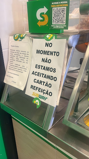 E havia saído para buscar um produto em uma gráfica, não levei cartões ou dinheiro, somente meu celular, estava passando pela Avenida João Cesar de Oliveira, senti fome e, vi a loja do Subway entrei e meu pedido foi montado e quando cheguei no caixa, não aceitava PIX. Perguntei a antendente se tinha alguma placa e ela disse que não, mas que não estavam aceitando essa forma de pagamento. Sei que nenhum local é 0vrifado a aceitar todas as formas de pagamento, mas uma loja como o Subway não aceitar, e não deixar uma placa avisando. Me senti constrangida, pois tinha outras pessoas na loja e me viram tentando pagar sem sucesso, com fome e sem o meu lanche, pq não deixaram uma simples placa informando que não aceitam a forma...