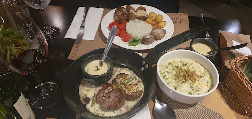 Fomos em casal um domingo a noite do feriado de 7 de setembro, realizamos reserva pelo whatsapp com antecedência. . Ótimo atendimento, ambiente lindoo, romântico e temático (castelo), localizado dentro da Pousada Castello Benvenutti. Possuem estacionamento externo. Como não estávamos com muita fome, resolvemos ir direto para o prato principal. Eu e meu esposo estávamos com vontade de comer uma carne bovina, e, para variar, cada um pediu uma das opções de pratos com carne bovino dos poucos que restavam no cardápio. Pedi um file (ok, nada demais, molho ok) com risoto de alho poró (esse realmente estava muito saboroso, um dos melhores que já comi). Meu esposo pediu um file (ok), acompanhado de com cogumelos recheados (gostoso), tomatinho confitado (faltou confitar mais, sem sabor e pouco cozido), arroz (ok), e batatas (ok), apresentação do prato bem amadora (vide foto anexo), no geral, prato sem graça / sem sabor, combinação de acompanhamentos mal pensada e mal executados, não gostamos. Ambos os pratos bem servidos, se não estiverem com muita fome dá para dividir. Pedi uma taça de vinho tinto da casa, mas estava horrível, não consegui beber e tive que pedir para trocar por uma opção de garrafa de 375 ml (e olha que não sou enjoada / seleta com vinhos, estou acostumada a beber vinhos no dia a dia mais baratos / com bom custo benefício). Nenhuma sobremesa do cardápio me encheu os olhos, não pedimos. Pelas avaliações esperava muito mais, talvez voltaria para experimentar outras opções do cardápio e ter uma avaliação final mais apurada, mas no geral nos...