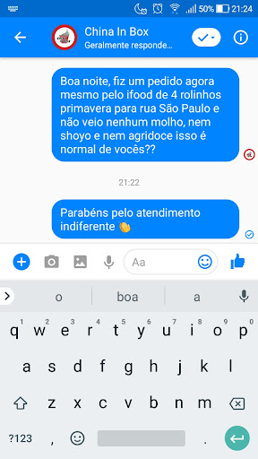 Cara, eu tratei bem os funcionários, inclusive disse que não precisava fazer com pressa... tentei ser gente boa. Mas a comida veio HORROROSA!!! Caramba, eu já comi umas 50x no China In Box do RJ, e nunca recebi uma comida horrível assim... Aqui em blumenau eu já comi umas 5 ou 6x ali nessa filial, umas 3 ou 4 vezes o lanche veio OK, padrão nacional de qualquer China In Box do Rj pelo menos, mas dessa vez e de uma outra que pedi em Outubro, vieram horríveis, pra vocês terem ideia, o box grande deve vir uns 900g mas eu joguei fora uns 750g nessas duas vezes. Fico muito indignado com isso pq não foi barato não, não é atoa que vim fazer textão. Nunca mais compro em China In box em Blumenau, já comi um outro yakissoba de um restaurantezinho numa cooper aí e veio mil vezes melhor cara e ainda paguei uns 30 reais só... Pra você ver... O pior que comprei pra alimentar minhas filhas, e nem eu nem elas quiseram PQP