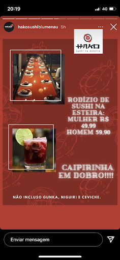 Read moreFazia um tempo que queria ir no Hako para ter uma experiência diferente com rodízio de sushi. Consultei o Instagram do restaurante onde, como na foto, consta “rodízio de sushi” NÃO INCLUSO GUNKA NIGUIRI E CEVICHE. Ao chegar a primeira coisa que perguntei foi em relação ao sashimi, logo o garçom me respondeu que não está incluso no rodízio (pois é! Deveriam deixar mais claro o que esta ou não incluso lá na propaganda do Instagram). Até ai tudo bem, ainda estava curiosa para ter a experiência do sushi na esteira, só que pegamos o pior lugar possível, a ponta da esteira, você tem que ficar olhando pra trás pra ver o que esta vindo e dar tempo de pegar, meu pescoço doeu. Ao chamar o garçom pra trocar de mesa (como solicitado desde o início, quando o primeiro garçom disse que achava difícil conseguir nos trocar de lugar, pois tinha mais 3 clientes que vieram depois de nós aguardando pra pegar uma mesa na esteira também) ele simplesmente disse que já ia nos atender e depois disso não olhou mais pra nós, deu preferência pra outro cliente que tinha chegado depois.