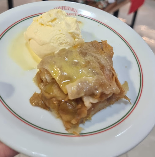 Segundo problema: o tamanho da fatia. Vide foto. Minúscula!!! Não devia ter 100g, ou aproxidamente 10x10cm . Não estava quente. Vi que o strudel sem sorvete também veio sem nata. Perguntei o motivo, e me disseram que agora a nata é cobrada a parte. Também não sabia o preço. Disse que deveria ser algo como o sorvete. Como estava com pressa, deixei sem.