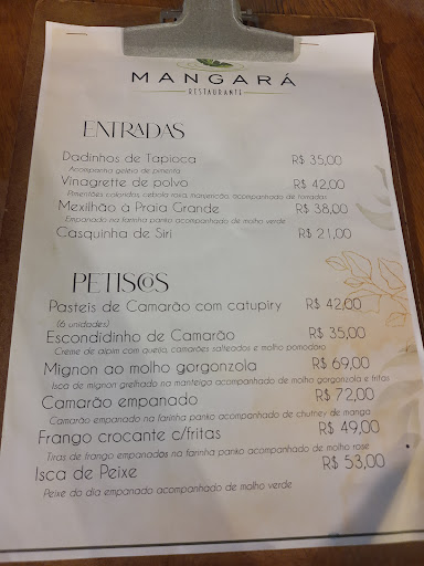 O Mangará Restaurante, localizado na Praia Grande, Arraial do Cabo, é uma excelente opção para quem busca uma experiência gastronômica de qualidade. Com um ambiente acolhedor e decoração charmosa, o restaurante oferece uma vista privilegiada para o mar, tornando-o ideal para apreciar o pôr do sol enquanto desfruta de uma refeição deliciosa. O cardápio é diversificado, destacando-se pratos com camarão e frutos do mar. Mas existem outras opções no cardápio. Os drinks também são excelentes. Tanto na apresentação, quanto ao paladar. O atendimento é outro ponto forte, com funcionários atenciosos e prestativos, garantindo uma experiência agradável do início ao fim. Seja para um almoço em família, um jantar romântico ou uma celebração especial, o Mangará Restaurante em Arraial do Cabo é uma escolha que certamente proporcionará momentos memoráveis. Aproveite e tire uma bela foto com a vista para o pôr do Sol ao mar em sua frente. Ponto gastronômico obrigatório na cidade.