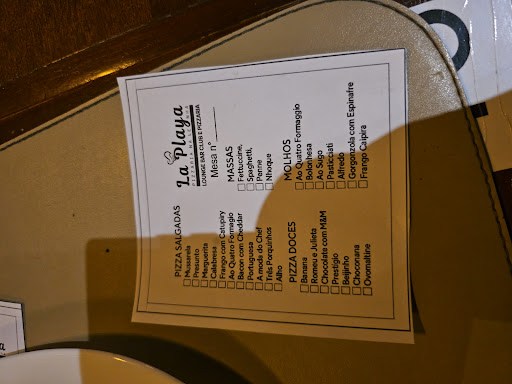 Minha experiência na Pizzaria La Playa foi bastante decepcionante. Logo no início, perguntei sobre os vinhos disponíveis e a resposta foi de que o “vinho da casa era ótimo”. Infelizmente, a realidade foi bem diferente: trata-se de um vinho de baixíssima qualidade, servido em taças, com sabor desagradável e claramente barato.