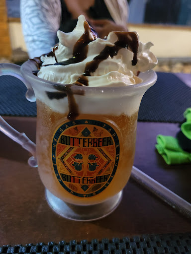 Pedi as cervejas amanteigadas do Harry Potter, que estavam deliciosas, e um hambúrguer de frango. O hambúrguer era simples, mas muito bom, e vinha acompanhado de batatas fritas por menos de 50 reais! (Confesso que poderiam ter colocado um pouco mais de batatas — sou bom de garfo, hahaha).