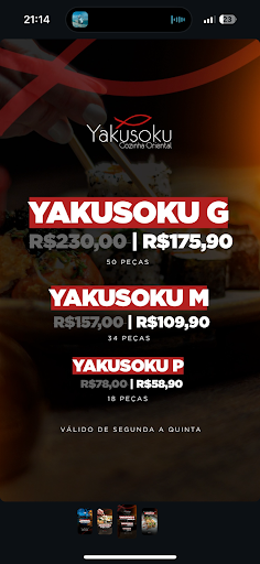 Read moreEstabelecimento não cumpre com todas as promoções conforme postado em seu perfil do instagram. Comprei um combo Yakusoku M (R$109,90) o que me daria direito a receber um Hot Blend de 8 peças conforme foto em anexo. Mas na hora que recebi o produto, vejo que o Hot Blend não havia sido incluido. A atendente me informou que não poderia me dar o Hot Blend, pois não é cumulativo com outras promoções.. Mas esta informação não está escrita em nenhum local das redes sociais, nem mesmo no próprio post em anexo! Ou seja, propaganda enganosa! Não costumo fazer comentários negativos, mas achei uma falta de respeito com o consumidor! E com certeza não sou o primeiro a reclamar do ocorrido....