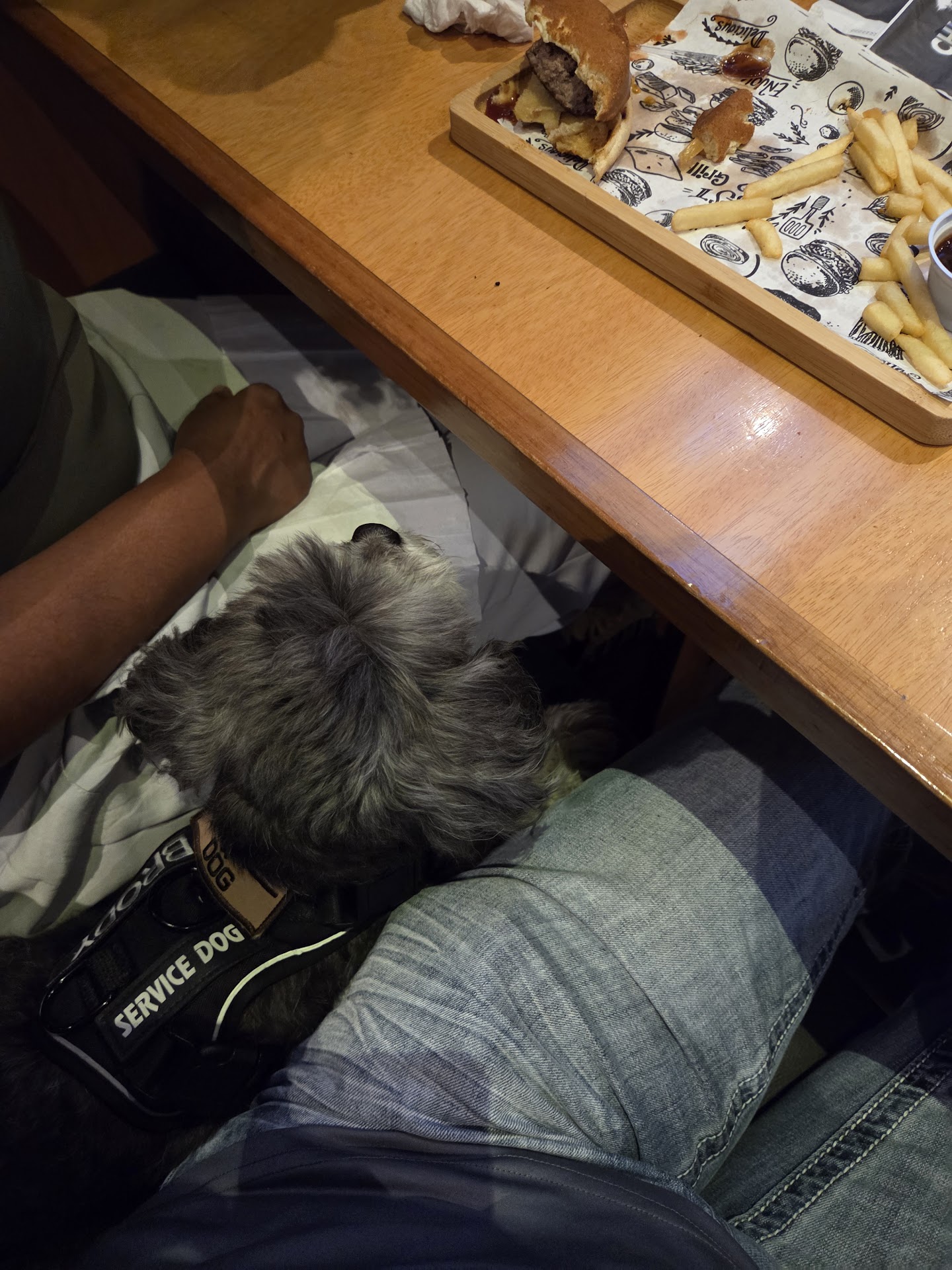Uma pessoa saiu, mas pagou a conta. Sem entender a situação, ele foi embora. Meu cachorro é uma mistura de Poodle e Shih Tzu, muito limpo e pesa cerca de 4,5 kg. Ele é educado, limpo e se comporta melhor do que a maioria das pessoas. Ele é treinado e respeitado.