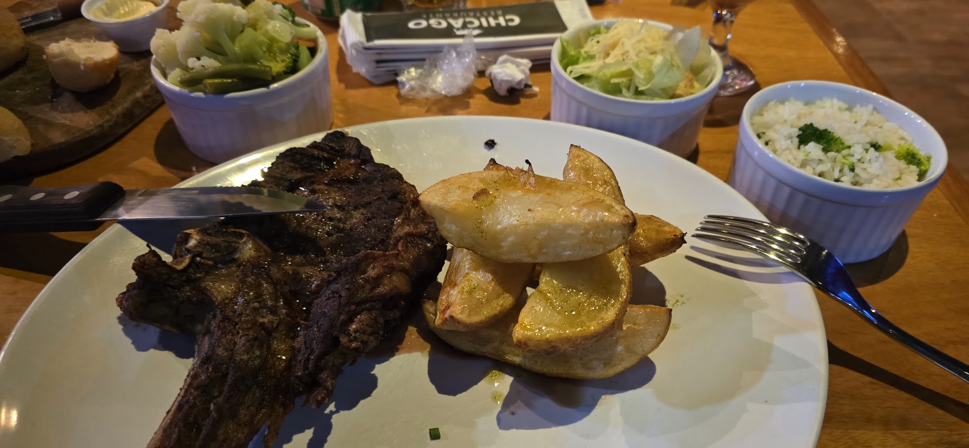 Read moreEstávamos em um grupo familiar de 6 pessoas, turistas em Caldas Novas e nao conhecíamos nada. Buscávamos recomendações pelo Google e tivemos uma péssima experiência na noite enterior. 3 de nós moramos nos EUA e encontramos esse restaurante que oferecia algo similar e decidimos visitar. Fomos recebidos na porta e logo encaminhados a uma mesa. Logo o atendente Nicolas veio para explicar sobre os pratos da casa e drinks. Pedi uma Virgin Margarita, que não teve nada a ver com o Margarita Mocktail dos EUA, mas estava bom tb. Fizemos o pedido variado : Lamb Rack, Rump Steak, short ribs, Bife de Angus steak e hambúrguer. Enquanto esperávamos perguntei ao Nicolas se serviriam um tira-gosto e ele disse que não era costume , mas nós trouxe um pãozinho quente e manteiga ( isso é praxe nós EUA). Nossa comida nao demorou mais que 20 minutos ( ponto positivo 👍), Nicolas sempre muito atencioso indicava aos servidores os pratos de cada um de nós. A comida estava exatamente como pedimos , alguns mal passado, no ponto e bem assado. Vegetais ao vapor e salada um pouco sem tempero. Trocamos o arroz branco por arroz com brócolis ( atente-se ao fato de que é cobrado a parte) . Sentimos falta de algum molho para acompanhar, uma vez que a comida só tinha itens " secos" ( arroz, vegetais, batata ) . A carne estava bem temperada. Saímos satisfeitos. Não provamos sobremesa , inclusive sugeri ao Nicolas que adicionassem Cheesecake ao cardápio, pois é sobremesa bem americana. Gostamos da agilidade, atendimento e rapidez em servir a comida. Não tinha musica alta, podíamos conversar sem gritar. O ambiente era agradável. Tínhamos idosos e crianças no grupo e todos se sentiram a vontade. Esse restaurante tem tudo para ser perfeito e ter muito sucesso ! Parabéns ❤️ e obrigada !...