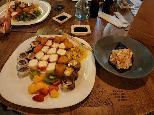 INICIAL Restaurante de comida estilo japonesa com sistema self service no peso e também a possibilidade da fazer algum pedido em específico ao sushi man. Possibilidade de levar seu vinho sem custo de "cobrança de rolha". Variedade boa de pratos no buffet. O restaurante é bastante agradável, dois ambientes (que podem ser três), um interno climatizado e dois externos. A decoração é bonita e envolvente com iluminação intimista. O atendimento na minha avaliação deixa a desejar. Sempre que frequentei houve um detalhe aqui ou ali que deixa a desejar. O preço é praticamente igual aos outros restaurantes da cidade, um pouco acima da média, nada que não valha a pena usufruir do ambiente e da variedade do buffet. Vale a pena ir conhecer e repetir a visita caso já conheça. Achei bem interessante a cobrança do "serviço" ser apenas dos itens pedidos ao garçom, o que você pega no self service não é cobrado serviço. Interessante, ponto para o estabelecimento. Quem quer, pode dar diretamente ao garçom o seu reconhecimento extra. Leu até aqui?...