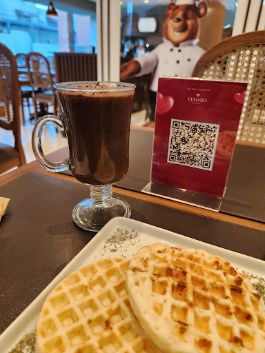 Chocolate quente com licor maravilhoso! Waffle de pão de queijo delicioso!