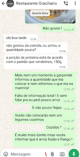 Read moreAtendimento péssimo Fui no estabelecimento por indicação, cheguei lá não informação nada , mais tinha informação no quadro como funcionava , sentei comi , pedi uma marmita para levar , chamei a garçonete ela não informou nada do que vinha , simplesmente falou tá bom ! Mais dei uma observação de pouco arroz APENAS e mais legumes , ficou pronta , paguei e fui embora , quando cheguei em meu escritório fui abri a marmita para meu colaborador e simplesmente me deparei com isso , no máximo tinha 200g de comida , entrei em contato com eles e simplesmente eles não deram atenção e nem se quer pediram desculpas ! Minha experiência foi horrível, não volto mais péssimo atendimento, péssimo lugar . Não recomendo falta de informação ao...