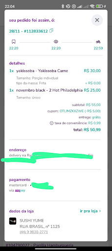 Read morePedi um delivery de Yakisoba e não veio molho nenhum, somente o macarrão a carne e os legumes secos. Reclamei com o restaurante e simplesmente cagaram, nem se quer um pedido de desculpas. Falaram que iriam resolver e a três semanas aguardo um retorno. Muito descaso com o cliente, jogeui dinheiro no lixo, literalmente pq não...