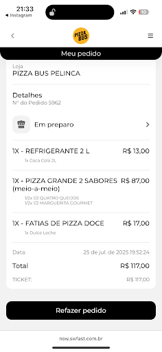 Infelizmente, tivemos uma experiência hoje que nos levou, a mim e à minha família, a decidirmos deixar de ser clientes. Como de costume, fazemos pedidos de pizza semanalmente. No entanto, hoje, após aguardarmos por duas horas, ao tentarmos efetuar o pagamento, a máquina apresentou erro ao processar nosso cartão Ticket Restaurante, o mesmo que sempre utilizamos.