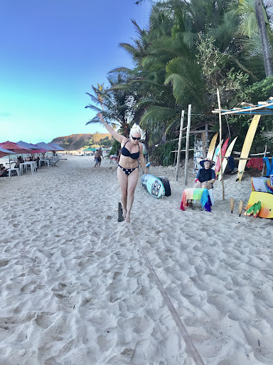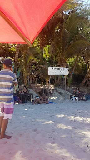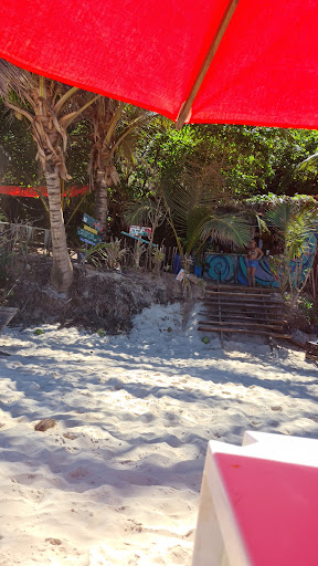 El lugar es algo distinto a las otras opciones que tiene la playa, el día que fuimos podíamos acceder a las instalaciones, tener una sombrilla, Dos reposera , mesa y hasta un cesto para la basura individual sin pagar más que lo que quisieras consumir, es decir si sólo te apetecía un agua de coco que es lo más barato 6 reales podías hacerlo y quedarte a reposar todo el día, a diferencia de sus vecinos que cobras 100 o 50 de consumición como mínimo, el baño es Muy particular tiene puerta pero nada más está entre los árboles y en el techo natural que hace los árboles es posible que te esté mirando un monito (pongo una foto mirarla atentamente) luego debo decir que está muy ordenado y limpio. Hasta un inodoro con agua en la mochila que no es fácil por ahí. Por otro lado la ducha al aire libre tiene el costo de 1 real. Pero lo más curioso es su biblioteca al aire libre y...
