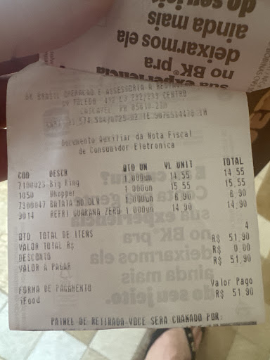 Read moreEstá ganhando 2 estrelas por causa da Gerente Bruna pq se defendesse do sistema do BK ia ser zero. Pedi uma lanche pelo Ifood e não entregaram e muito menos cancelaram. E ae? O que fazemos? Vamos no bk tentar resolver.. Eles não tinham a Pepsi q pedi e por isso dependiam da central entrar em contato com o cliente e ver se quer....gente presta atenção estou pedindo fast-food comida rápida e vcs estão deixando a desejar nesse quesito. Abram um meio de comunicação com o cliente se querem continuar com entrega pelo ifood... desse jeito vcs só vão perder clientes. Péssimo atendimento do bk via ifood. Melhor não vender para entrega se está dessa forma. Revejam a maneira de atender via aplicativo dessa forma não está...