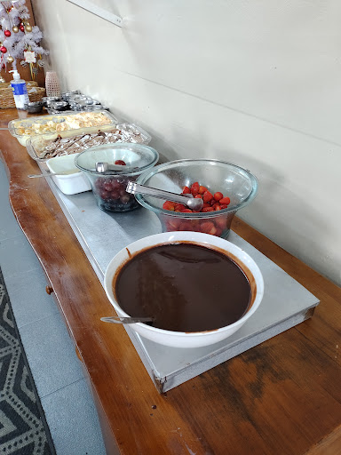 Read morePéssima experiência desde a entrada. Chegamos e estava caindo uma chuva torrencial, o funcionário com uma sombrinha ficou nos olhando e não veio nos auxiliar. Meu esposo estacionou e eu entrei primeiro, pois ele pegaria nosso filho para trazer no colo, havia muitas poças. Quando cheguei na porta, o funcionário estava alterado e reclamando de onde meu esposo e outros clientes haviam estacionado, pois segundo ele, não vimos o cone que ele havia posto, que seria para o ônibus que estavam aguardando. Falei que o cone não era autoexplicativo, que não havia placas, que mal podíamos ver a estrada de tanta chuva. Ele foi lá no carro pedir para meu esposo colocar mais longe o carro, e ao invés de esperar e já trazer, pelo menos meu filho, embaixo da sombrinha, ele voltou para a porta e deixou meu filho e meu esposo saírem na chuva. Perguntei se a sombrinha era do restaurante, pois eu mesma a pegaria para buscar os dois, e o funcionário ignorou, só ficava repetindo de maneira alterada que ele estava espero ônibus. Conclui que o único interesse do estabelecimento é para excursões. Uma outra pessoa que chegou juntamente comigo, indignada, acabou alterando a voz com o funcionário. Não apareceu ninguém responsável para contornar a situação ou ser solícito com quem chegava ao local. Com os ânimos alterados e vozes altas, meu filho de 5 anos começou a chorar dizendo que estava com medo. Permanecemos em outra mesa, longe e não fomos embora pois já havia pago antecipadamente. A comida não chega a ser ruim, mas não tem nada de agradável. O banheiro feminino não funcionava, o de PCD também não, o masculino estava muito sujo. Ambiente feio, aspecto de sujo e nada agradável. Na saída, o funcionário do início estava com um guarda sol, ajudando apenas as pessoas do ônibus, os demais dane-se. Nesta foto tem meu filho e meu esposo saindo na chuva, que embora no final já estivesse mais branda, não teve ajuda do...