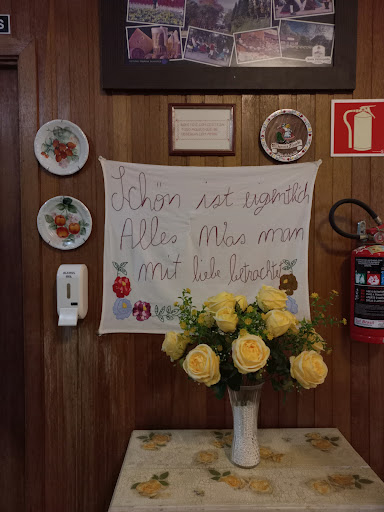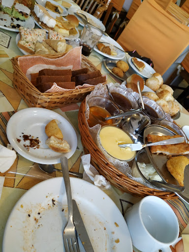Foi uma ótima experiência gastronômica, muito agradável e gostosa! O atendimento foi excelente, tomando os cuidados devido à pandemia. O local é muito agradável, com decoração no estilo alemão, muito limpo, música alemã de bom gosto. Ótima variedade de comidas e muito saborosas! Gostinho caseiro, lembra muito comida de vó, feita com amor e carinho. Reposição a vontade. Vou tentar lembrar de tudo que veio a mesa: três tipos de pães, pão de queijo, croquete, enroladinho de salsicha, pastel de queijo, pastel de carne, bolinho de aipim, polenta frita, linguiça e salsicha fervidas, frango e carne de porco empanados, waffle, pepino, rabanete, ovo de codorna, cenoura em conserva, chucrute, dois tipos de queijo, morcilha, salaminho, copa, manteiga, requeijão colonial, chantilly, mel, schmier de cana, geleia de laranja, geleia de morango, café, leite quente, chocolate quente, vinho, chá de maçã, rocambole, nega maluca, bolo de cenoura, bolo de limão, bolo de goiabada, mais uns cinco tipos de bolos, mini pizza, suco de laranja e de uva. Além de todas comidas que trazem na mesa, ainda tem um balcão refrigerado onde tinha pelo menos seis sobremesas e três tipos de tortas (não aguentei provar, já tinha comido demais hehehe). O senhor que nos atendeu era muito solícito, simpático e eficiente. Nos ofereceu também outros chás, como boldo ou camomila. Indico de olhos fechados. Ah, tem...