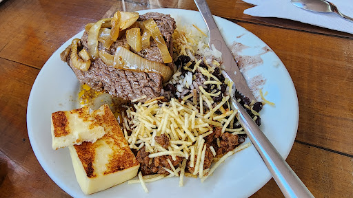 Read moreComida caseira boa, self-service que quase compensa o valor cobrado pela alimentação livre (R$ 45 pix ou dinheiro, R$ 50 no cartão). Toda a refeição é acompanhada por batata frita, que eles trazem à mesa (podemos pedir mais batata). Pessoalmente, a parte do churrasco não me chamou a atenção por conta da carne estar na chapa há algum tempo, o que a deixa seca. No entanto, o self-service estava muito bonito, com exceção a lasanha, que estava ressecada. A carne de panela com macarrão e a coxinha de frango assado estavam muito bons (eu achei o macarrão muito bom. Tive, inclusive, a impressão da massa ser artesanal). Eu sugiro que a parte do churrasco seja substituído por uma estação de macarrão feito na hora. Talvez fosse mais atraente disponibilizar massas feitas na hora do que oferecer um churrasco comum. No geral,...
