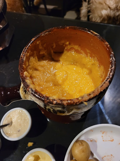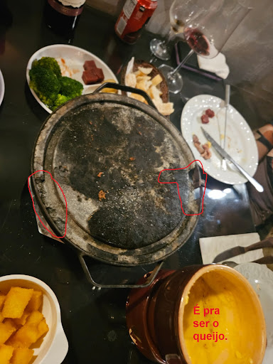 Read more😠 Crítica Detalhada: Minha visita a este estabelecimento foi, infelizmente, uma experiência extremamente decepcionante, especialmente em relação à higiene, ambiente e qualidade dos ingredientes. O estado do ambiente é o primeiro e mais grave problema. O local parece estar muito depreciado e com sérias necessidades de manutenção e limpeza: • Piso e Sujeira: O chão estava visivelmente sujo, com manchas de gordura e sujeira acumuladas, o que é inaceitável em qualquer local de alimentação. • Estrutura: Até mesmo a estrutura física apresenta problemas, como as pedras pra preparação do Fondue. • Fumaça: A falta de um sistema de exaustão adequado é crítica. A fumaça no ambiente é tanta que chega a arder os olhos, tornando a permanência no local muito desconfortável. A qualidade dos ingredientes também deixou muito a desejar e levantou dúvidas sobre a composição dos pratos: • Queijo: O queijo servido apresentava uma textura e gordura excessivas, sugerindo fortemente a adição de ingredientes de baixo custo como farinha e margarina para aumentar o volume ou a consistência. • Chocolate: Os chocolates eram de péssima qualidade, o que comprometeu totalmente a sobremesa/experiência. Observação: As fotos que tirei comprovam a falta de cuidado e a aparência questionável tanto da comida quanto do ambiente.