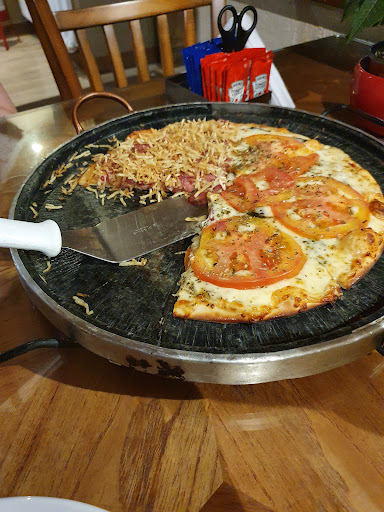 Uma grata surpresa! Fomos conhecer a pizzaria a partir de uma indicação da internet em uma sexta-feira a noite. Eles trabalham com pizzas a la carte e rodízio. O preço é justo para qualquer uma das opções. O rodízio custa R$ 99,00 p/ pessoa (Ago/2024), mas eles estavam com uma promoção que saía R$ 60,00 p/ pessoa. No a la carte, a pizza média sai por R$ 84,00 com até 2 sabores, e R$ 104,00 com até 3 sabores (Ago/2024). Aproveitamos a opção do rodízio. As pizzas eram todas deliciosas, com ingredientes de qualidade e bem recheadas. Massa fininha, bem passada e fatias no tamanho certo. Todas tem um sabor marcante de alho, o que para mim não foi um problema pois gosto bastante. Um ponto a destacar é o ritmo do rodízio. Não é o tipo de lugar que serve uma pizza atrás da outra e tu não dá conta de comer tudo. Elas são servidas devagar, o que pode incomodar quem gosta de comer correndo. Devido ao ritmo, pegamos o cardápio e pedimos para o garçom todos os sabores que gostaríamos de experimentar. Todos os sabores foram atendidos na mesma ordem que pedimos. As pizzas doces são espetaculares. Destaque para a pizza de sorvete. No rodízio é servido batata frita. O atendimento é ótimo, todos nos atenderam com atenção e simpatia, além de toda hora perguntarem se estava tudo certo e se precisávamos de alguma coisa. Além das pizzas, existe um buffet de sopas e saladas que está incluso no valor do rodízio. As sopas estavam uma delícia, sendo elas: capeletti, creme de batata, creme de moranga e creme de costela (esse último bastante salgado, mas muito bom). O restaurante fica dentro do Hotel Sky Centro mas com uma entrada separada. Ficamos bastante satisfeitos com a experiência e com certeza voltaremos em uma próxima...