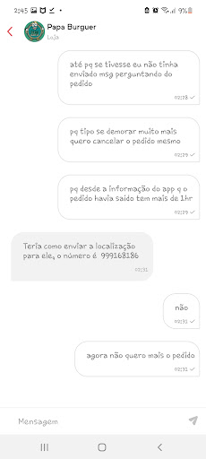 Bom dia, entrei em contato para avisar que minha observação não foi atendida e eu não irei consumir o lanche. Favor se atentar na produção dos pedidos, na educação e no atendimento ao cliente também. Pode deixar assim. Passar bem!”