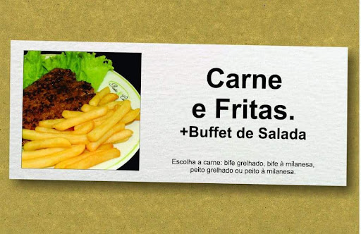 Nos pratos com carne, a mesma pode ser escolhida entre bife grelhado, bife à milanesa, peito de frango grelhado ou peito de frango à milanesa.