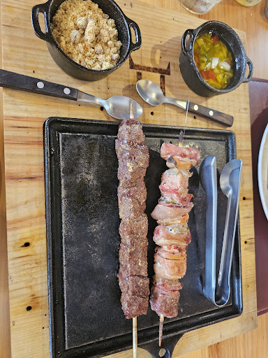 Read moreA casa integra um conjunto de boas opções que esta via gastronômica oferece. A proposta é oferecer espetinho e salgados, doces e mistos, em porções individuais, em combos e em Sequência com vários acompanhamentos. Além disso em cada dia tem um prato especial, sendo que no sábado em que estivemos lá, tinha feijoada no valor de R$ 39,90 (janeiro de 2025). Experimentamos a feijoada que era em sistema de bufe sem protetor salivar e com os seguintes itens: Feijoada com as carnes misturada ao feijão que estava com o caldo muito ralo, caldinho de feijão que estava com temperatura inferior a ideal, farofa, fatias de laranja, abacaxi, farinha de mandioca e vinagrete. Também foi servido a mesa um prato com arroz, couve refogada, banana a milanesa e dadinhos de aipim. Pedimos também três espetinhos, sendo um de lombo com abacaxi, outro de alcatra e outro misto. Deu a impressão de os espetinhos já estão estarem pré assados e serem apenas aquecidos antes de serem entregues na mesa. Para beber tem chopp da Brahma de 300ml servido em caldereta e de 500ml servido em canecas geladas, além de destilados, vinhos e bebidas não alcólicas. A chopeira não tem muito recurso para oferecer um chopp bem tirado, como manda a regra da Brahma. De brinde foi oferecida uma cachaça com abacaxi, que estava uma delícia. São dois ambientes, sendo um interno e fechado, sem um controle adequado do conforto térmico e outro ao ar livre e pet friendly. Os toaletes são simples e limpos. O atendimento é carismático e descontraído. O cardápio não é digital, não tem álcool gel nas mesas, os guardanapos não são envelopados e o azeite de oliva é de qualidade inferior, mas os talheres são ensacados e na posição correta O custo x...