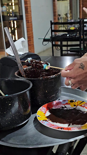 O tal Fundue de marshmallow com chocolate, não combinou, fica muito enjoativo, doce demais, morango seria o ideal para quebrar o doce do chocolate.