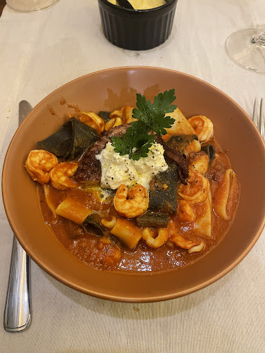 As bruschettas estavam excelentes, especialmente pelo sabor do molho pesto, que foi um destaque. Já em relação aos pratos principais, senti que deixaram a desejar, tanto em sabor quanto em apresentação. A impressão é de que a apresentação não é o ponto forte da casa, e os sabores, apesar de corretos, são simples, sem nada que chame atenção. A carne veio no ponto certo, mas estava pouco temperada, faltando sabor. O prato de frutos do mar, por sua vez, pareceu ter sido montado de forma apressada, sem o cuidado esperado.