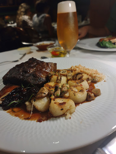 Fui em duas pessoas ao restaurante. Ao nos acomodar, primeira coisa que faço é pedir uma agua com gas: “dois copos completos, por favor.” A agua é trazida e servida em duas taças sem nada. Nem gelo nem limão. Tudo bem, afinal, ela pode não ter ouvido e/ou podem nem ter essa opção, cogitamos. Peço uma abobrinha de entrada e um tartar de file mignon. O zucchine cortado de forma fininha estava muito bem executado: extremamente temperado, tinham diferentes texturas saborosas como a semente de abóbora (acredito eu que eram), rúcula trazendo acidez juntamente a um azeite balsâmico (nao encontrei a segunda pagina do menu online para tirar minhas duvidas, mas acho que era) + um molho cítrico colocado de forma generosa, mas necessariamente cirúrgico. Fiquei animado demais, “vim ao lugar certo na primeira refeição” pensei. Bom seria ter ficado por ai mesmo. O tartar era mediocre para menos. Pecava em excesso de sal, a pimenta se destacava com facilidade e roubava toda atenção, consegui sentir um ketchup mas nada de mostarda. A textura era ótima, bem picado e servido em cima de cubos de gelo que alteram a temperatura conforme se come, mas nao vejo como grande problema. Foi servido um pastel de vento juntamente ao prato: extremamente frio, meio duro e, no mínimo, estranho. Gente, em qualquer feira do Brasil costumam acertar fritura (com todo respeito aos feirantes e suas respectivas comidas, muitas vezes bem feitas). É tão mais fácil melhorar um prato com fritura, mas nesse caso deixou claro o descuido da casa. O importante é que quem pediu o prato, gostou e comeu inteiro. Ah! ja ia me esquecendo, solicitei a atendente outra agua: “mas agora me vê com copo completo, por favor”. Ela reagiu como se tivesse esquecido da primeira vez e trouxe UM dos copos repleto de gelo, sem limão. Eu ainda fico sem entender, mas nao peço de novo nem explico. Certas coisas subentende-se que o restaurante faça por bom senso (calma, eles passam longe disso)